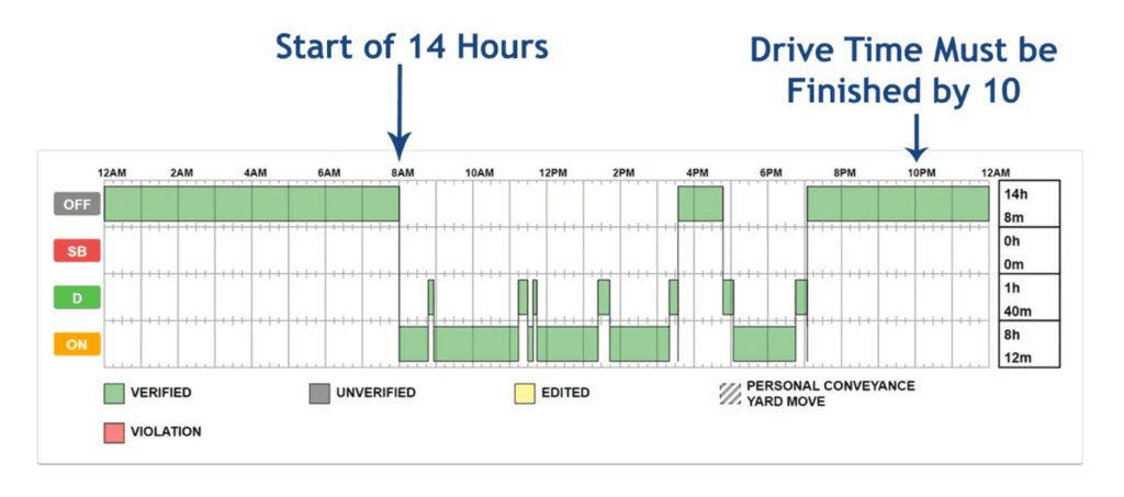 According to Tesla, it will take approximately 30 minutes to charge the battery back to 80%, which should get the driver roughly 400 miles, or about 7-8 hours. Commercial truck drivers are allowed a 14-hour workday, but they can only drive for 11 of those hours. The remaining 3 hours are for meals, breaks, etc. This is a strict start/stop schedule, meaning that if a driver begins driving at 8:00 a.m., they cannot drive past 10:00 p.m. Additionally, drivers are required to take a 30-minute off-duty break after no more than eight hours of driving.